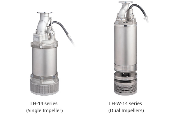 The LH-14 series has a single impeller, and the LH-W-14 series has dual impellers. The LH-14 and LH-W-14 series are available in a wide product lineup, covering a discharge bore diameter of 80 to 200 mm, motor output of 11 to 110 kW, and maximum head of 51.8 to 184 m.