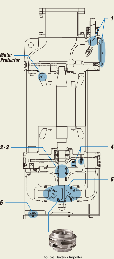 The biggest feature of these pumps is that they powerfully draw large volume of water from both upper and lower sides of the double suction impeller.
