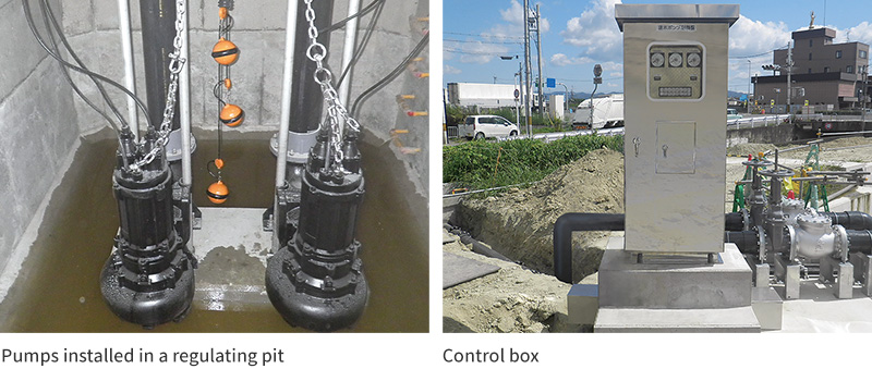 This pump system serves to drain a municipal road that passes under an expressway junction, via two rainwater regulating pits.