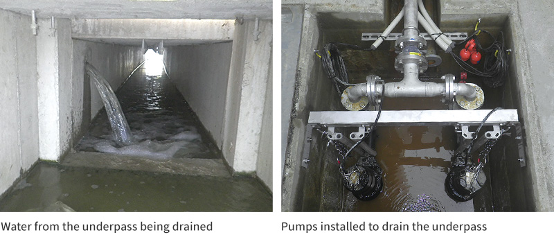 A municipal road that passed under a national highway was extended in the east-west direction when the junction was built. Two rainwater drainage pits were built and pumps were installed to drain rainwater collected from the underpass.
