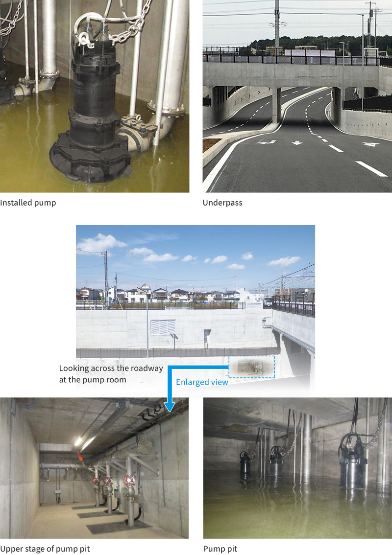 Tsurumi's pumps were chosen to drain water from an underpass that runs east-west underneath the railway tracks at Nagareyama Otakanomori Station where the Tsukuba Express and Tobu Line intersect in Nagareyama City, Chiba Prefecture. Highly efficient models with large diameter bore for discharging solids were delivered for the job. Since the pumps and flood warning signs went into service in October 2017, no vehicles have been trapped by flood waters.