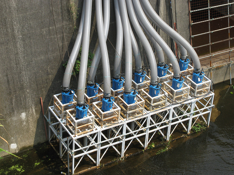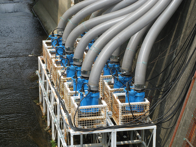 Our twelve KRS-series of submersible dewatering pumps were selected by a local government for use as a seasonal countermeasure to inland flooding caused by storm water. For the project, a permanent platform for installing the pumps was built in the river and, only during storm season, rental pumps and generators are installed. The scaled-down facility is designed to pump storm water that results from seasonal downpours to the river in a short time. To the pleasure of the customer, the pumps used in this facility are easily installed, maintained and removed.
