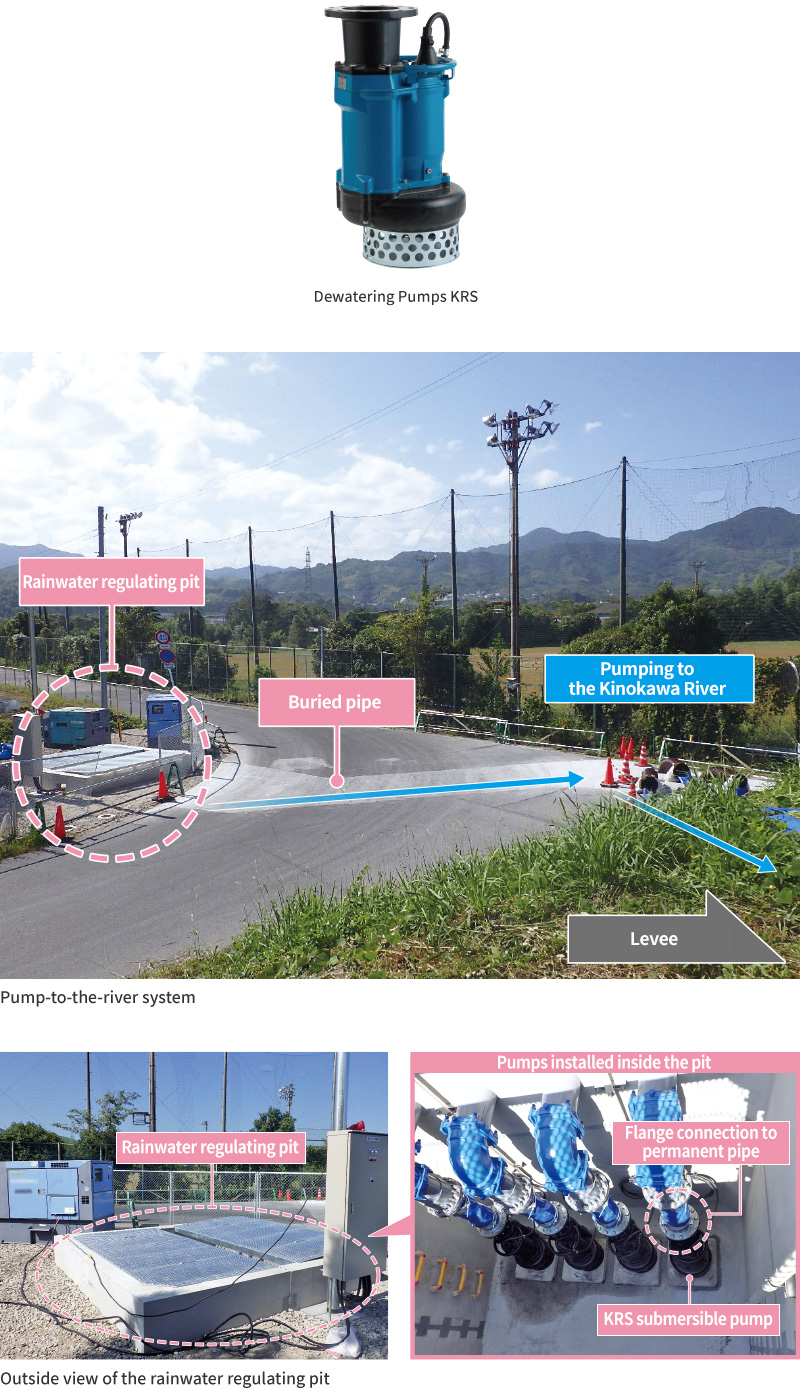 A particular municipality in Wakayama Prefecture that had been troubled with flash floods caused by downpours asked Tsurumi for help with a pumping facility for managing the impacted location. From the discussions, it was decided to build a new rainwater regulating pit and install four KRS submersible pumps of the energy-saving type. The pumps were also coated in epoxy resin as protection against corrosion, because of the extensive amount of service they were expected to see. During heavy rains, the system pumps the rainwater to the Kinokawa River.