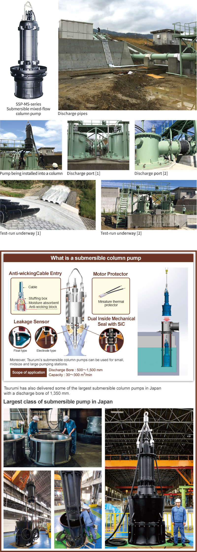 Tsurumi delivered a pair of submersible mixed-flow column pumps for a rainwater drainage system to a storm water pumping station at a new industrial complex in Tokushima Prefecture. The pumps were installed by simply lowering them into column pipes and came outfitted with diverse equipment features for enhancing reliability. Tsurumi is also providing follow-up maintenance, is promptly supplying any needed parts and is poised and ready to dispatch service engineers to the site in the event of an emergency.